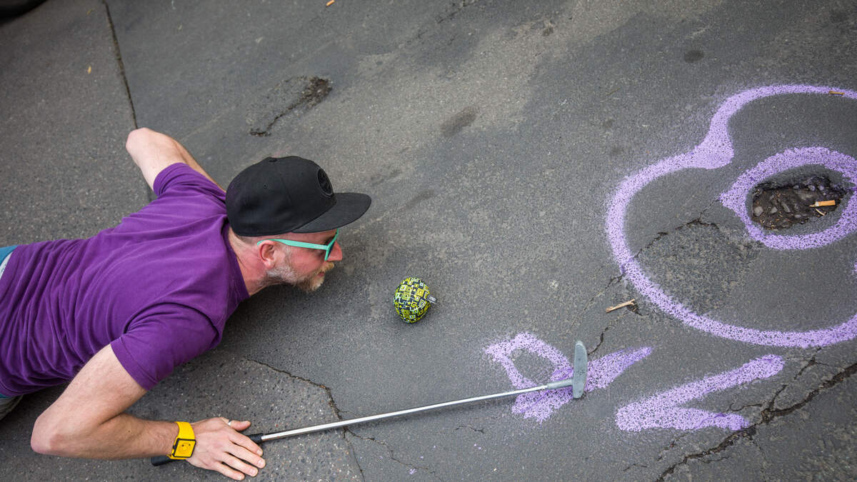 Bolazs Vesszoesi eyes a pothole in a street in Offenburg, as a golf hole during a pothole-minigolf event to draw attention to bad street conditions in Offenbach, on May 17, 2018. (Photo by Frank Rumpenhorst / dpa / AFP) / Germany OUT (Photo credit should read FRANK RUMPENHORST/DPA/AFP via Getty Images)Photo: FRANK RUMPENHORST / DPA / Getty Images