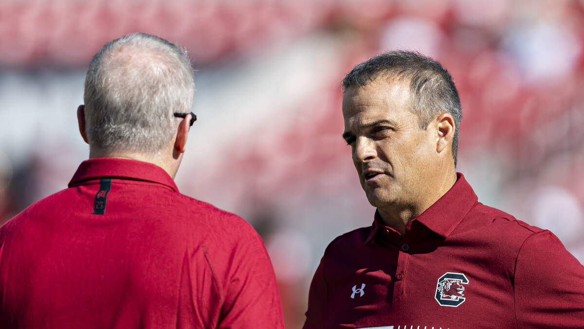 FAYETTEVILLE, ARKANSAS - SEPTEMBER 10: Head Coach Shane Beamer of the South Carolina Gamecocks talks with Athletic Director Hunter Yurachek of the Arkansas Razorbacks at Donald W. Reynolds Razorback Stadium on September 10, 2022 in Fayetteville, Arkansas. (Photo by Wesley Hitt/Getty Images)Photo: Getty Images